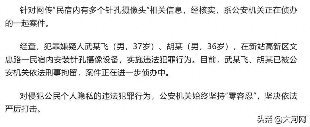 经查,犯罪嫌疑人武某飞(男,37岁)、胡某(男,36岁),在新站高新区文忠路一民宿内安装针孔摄像设备,实施违法犯罪行为。目前,武某飞、胡某已被公安机关依法刑事拘留,案件正在进一步侦办中。