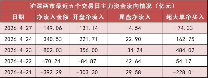今日沪深两市主力资金开盘净流出131.14亿元,尾盘净流出4.54亿元,两市全天资金净流出149.06亿元。