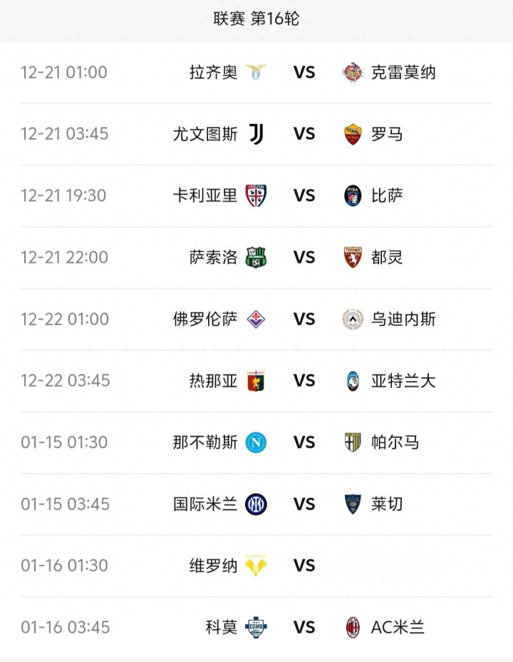 12月20日至21日如何选择股票技巧,意甲联赛第16轮将进行6场比赛,剩下的4场比赛因米兰双雄、那不勒斯和博洛尼亚四队参加意超杯而推迟至2026年1月14日和15日进行。本轮焦点战有:尤文图斯vs罗马和不胜的紫百合主战神经刀球队乌鸡。