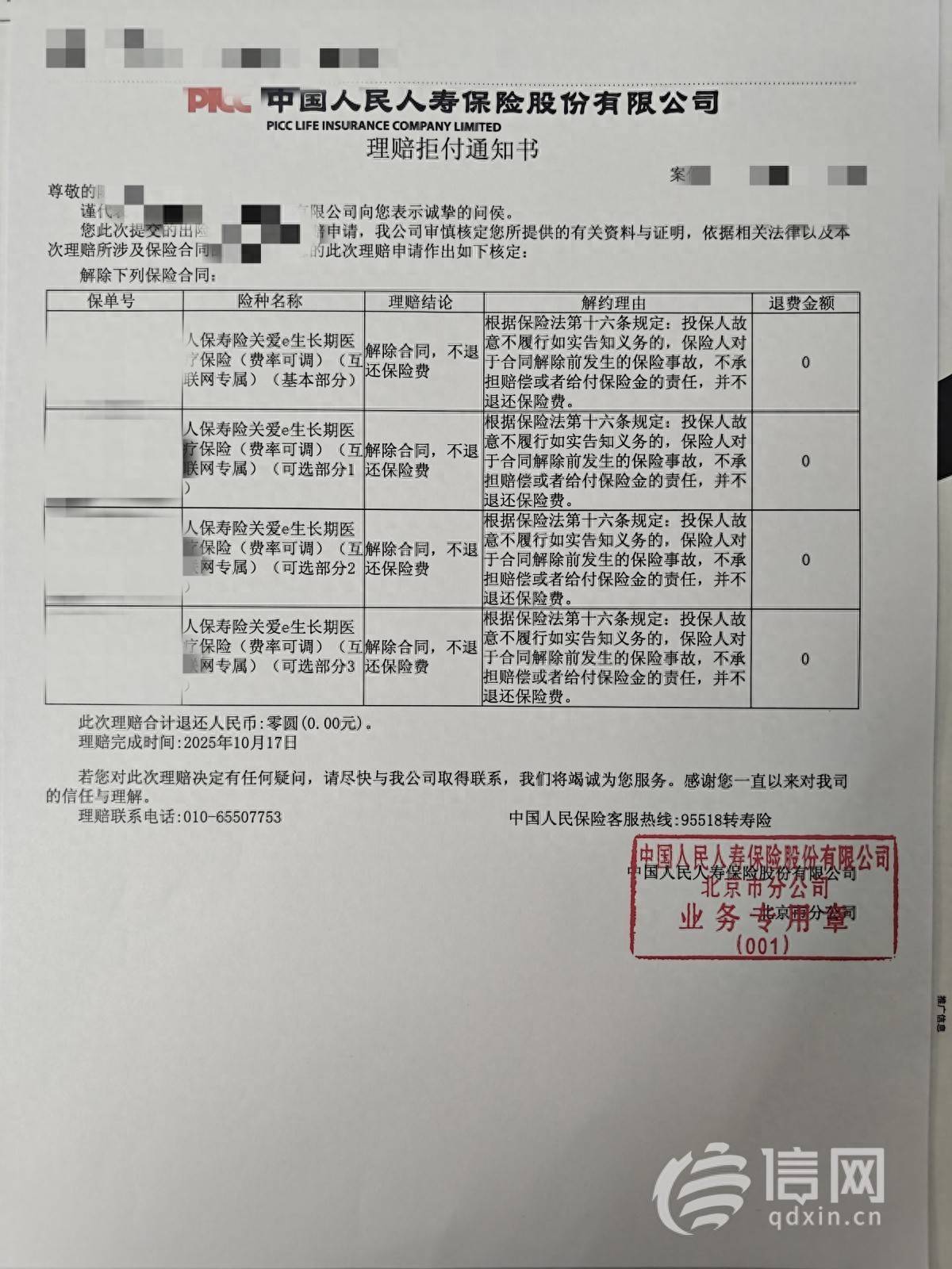 多次与保险公司沟通无果后,王先生向12378“银行业保险业消费投诉热线”进行投诉,可投诉最终被转回至人保寿险,对方仍坚持解除合同、拒赔且不退还保费。